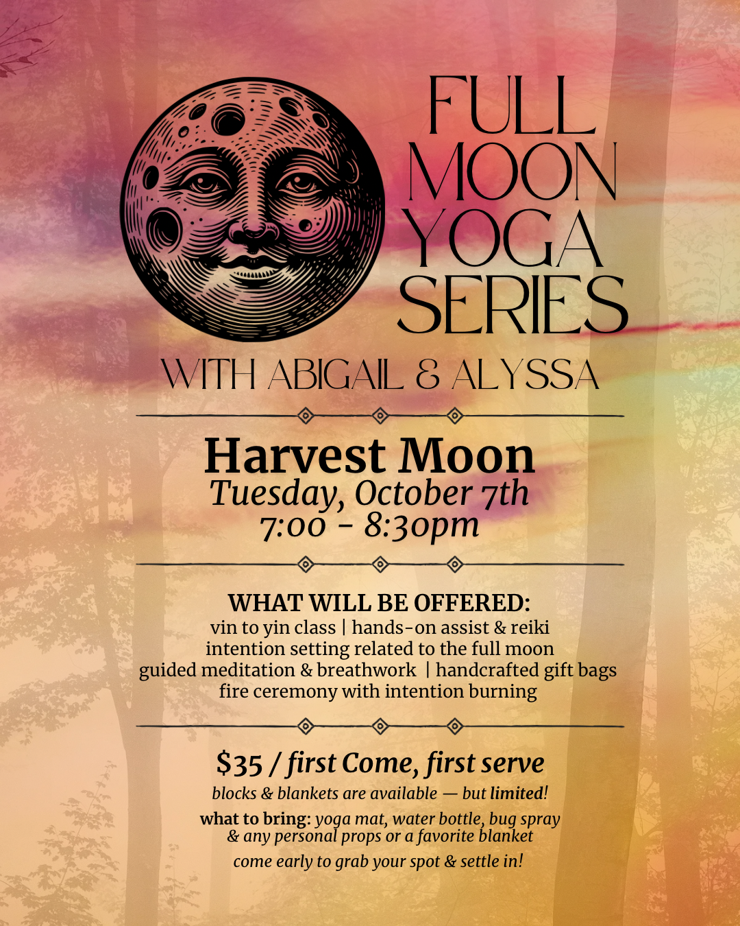 In this Vin to Yin Full Moon Series, we will combine intention, breathwork, & movement to welcome in a deeper connection to spirit. In this safe, sacred space we will ground into our masculine & feminine sides. Hands-on assists & Reiki are offered throughout the class to help release self-limiting beliefs & support reclaiming the power within each of us. Join us for this summer awakening, once a month from June–September, & experience the healing connection that comes from the moon & sisterhood.